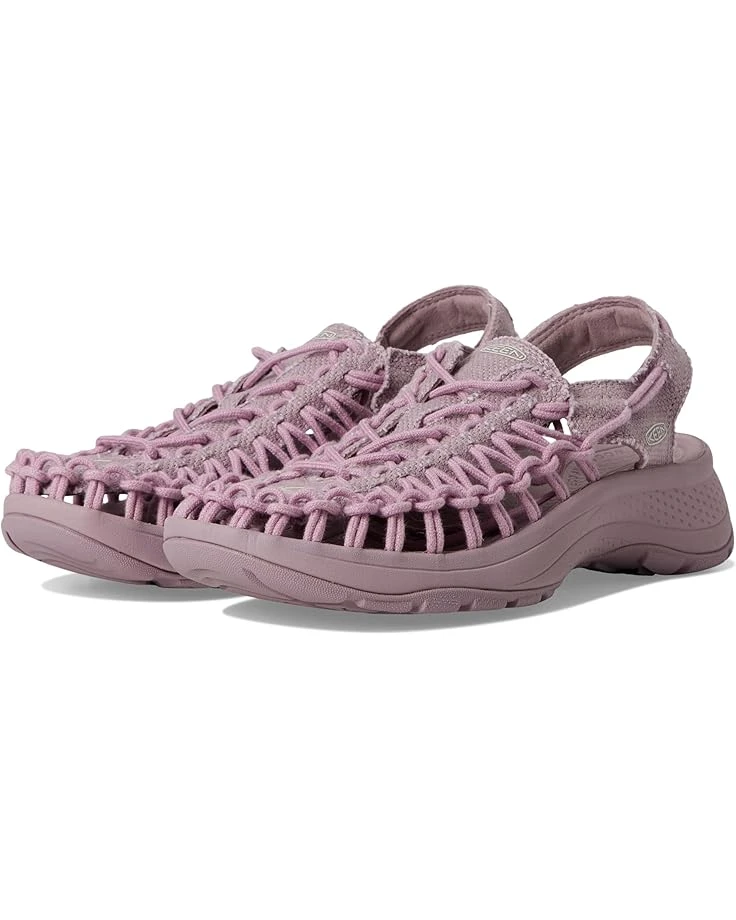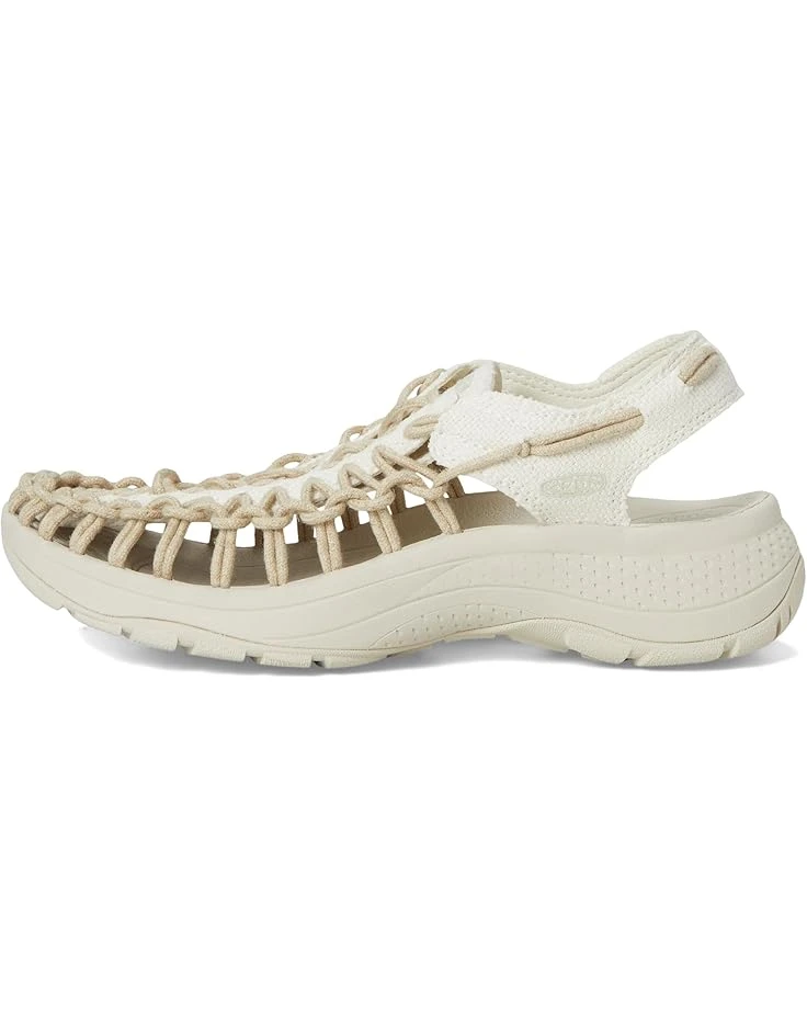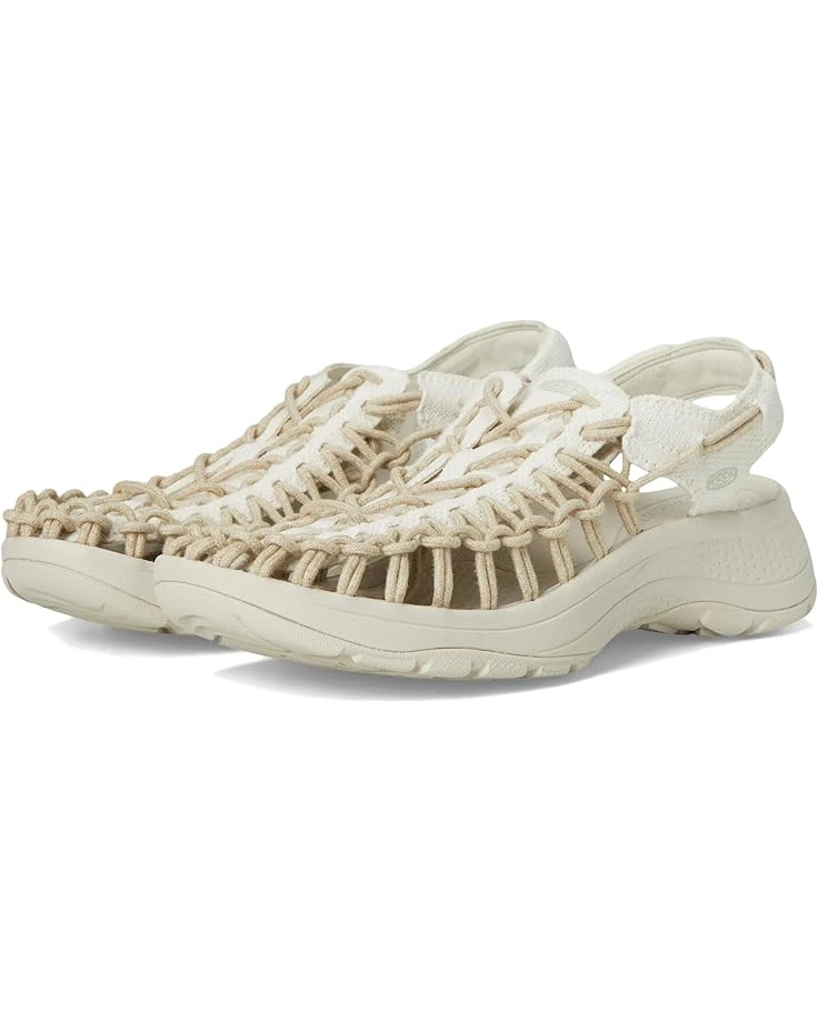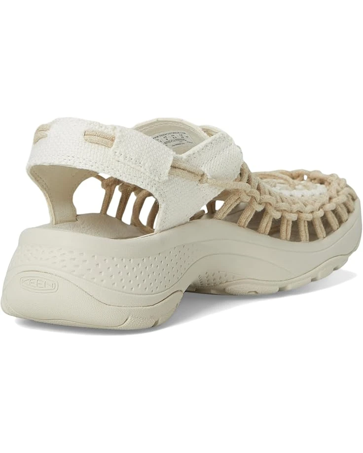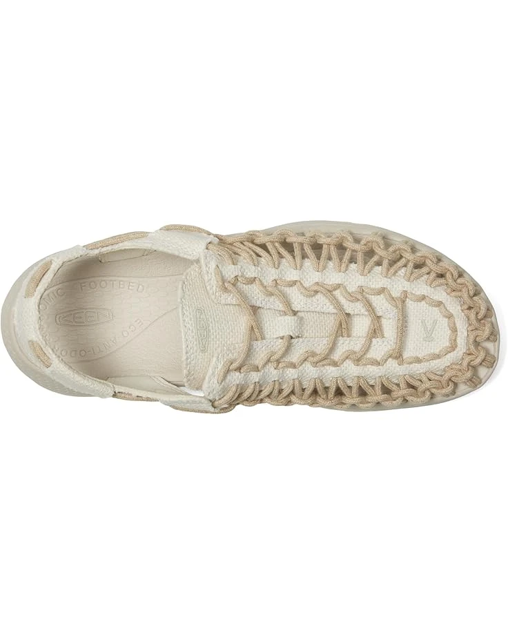 - Lift up your style wearing the KEEN® Uneek Astoria Canvas. Crafted from canvas upper, this pair of sandals features round toe, contoured fit that follows the contours of your foot for a comfortably snug fit, foam strobel board underfoot for an extra layer of cushioning, recycled plastic bungee cord and lace-lock toggle for an instantly secure fit, foam midsole for lightweight cushioning, shock-absorbing foam insole with arch support for all-day comfort, stability shank delivers lightweight stability, and Eco Odor-resistant for natural, pesticide-free odor control.